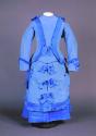 DescriptionGirl's three-piece dress, consisting of a bodice (.a), skirt (.b), and overskirt (.c), made of two tones of blue wool/silk poplin. The bodice is hip-length and fitted with princess seams. It has a center back opening which fastens with seven abalone buttons hidden under a placket; the placket is decorated with nine turquoise-green poplin-covered buttons. The bodice has a high, round neckline, which is piped with contrasting dark blue silk. The sleeves are set smoothly into the armscye and are decorated at the wrist with non-functioning turn-back cuffs edged with a pleated ruffle of bright blue poplin. A blue silk ribbon bow further decorates the cuffs. The pleated trim of bright blue poplin is also used as a decorative edging along the bottom of the bodice, beginning at center back and continuing around the hips and then curving up the left and right bodice fronts to the shoulders. A blue silk ribbon bow is stitched on each shoulder; the bows have approximately ten-inch tails. The lower center front edge of the bodice is dipped and piped with the bright blue poplin. White plain-woven cotton is used to line the entire bodice.