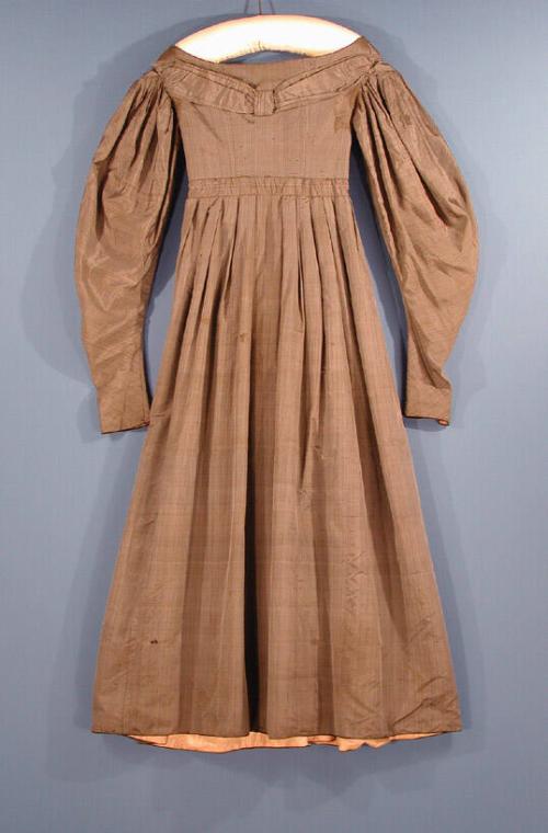 DescriptionA: Blue-gray silk day dress, with leg-o'-mutton sleeves, wide neckline, and full skirt. The dress bodice is decorated across the front from shoulder to shoulder with a gathered strip of self-fabric, controlled by a loop of the silk at center front, about two inches below the neckline edge. The top of the sleeves are pleated into a triangular piece of the silk. This triangular piece is piped, along with the armscye, the neckline edge, and the curved side back seams. The skirt is set into the waistband with knife pleats across the front and sides; it is cartridge pleated at center back. The bodice is lined with plain-woven undyed cotton. The skirt is lined with glazed pink cotton. The wrist openings and hem are edged in fine black silk cording. The center back opening is nineteen inches long and closes with black enameled hooks and eyes (not original.)