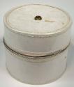 DescriptionTwo brown hairpieces in a white zippered case purchased from the G. Fox & Co. specialty salon in the late 1960s/early 1970s. Round case with silver zipper and cream colored stitching. On the top of the case in the center is a gold ring. Hairpieces are stacked on top of each other in case. Interior of case has a gold and cream checker pattern.