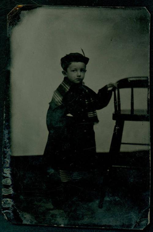 DescriptionFormal studio portrait of a small boy standing beside a highchair. He is wearing a coat, hat, and a striped scarf.