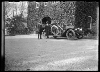 DescriptionA two-door passenger automobile is parked on a street with trees in the background. The automobile is a single seater convertible model with the top up.