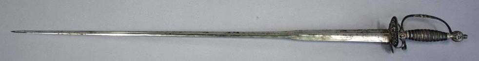 DescriptionSilver hilted presentation type sword, 3 edged blade with wider section at base which evenly tapers to tip of blade. Blade is engraved with scrolling designs at base, very worn. Third side of blade extends on right side, hilt extends out the same distance on either side and have 2 small six-pointed stars flanking a larger eight-pointed star with scrolling design surrounding them. Knuckle bar features spiraling grooves with an eight-pointed star in the center of both sides, on left side near pommel are four stamps. The pommel has an eight-pointed star on either side with scrolling floral designs surrounding them (pommel is ball that is hollow) handle is silver wrapped in silver coils. Scabbard is leather, 3 sided, with silver bands and carrying rings. Top throat band is engraved with circular design with floral designs at the bottom; On reverse of throat band is engraved: "Bland/ St. James's".