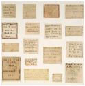 DescriptionGroup of samplers, consisting of 16 small samplers, each mounted and displayed in a single modern frame, separated from each other by a custom-made mat. The samplers are generally worked in browns, mints, grays, creams, and green silk threads on plain-woven linen ground in cross and back stitches. The samplers vary in shape.