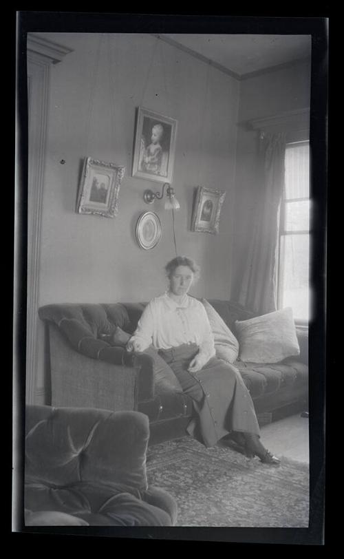 DescriptionView of Mary Pierson Cheney in the library at her home, the Horace Bushnell Cheney house, at 78 Forest Street in South Manchester, Connecticut. She is sitting on a plush couch to the left of a window. There is a small lamp mounted to the wall above her head. There are four framed pictures arranged around it.