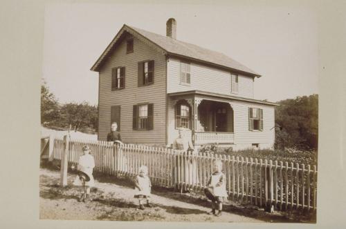 DescriptionTwo women and three little girls stand in front of a small two-story Victorian house. There is a picket fence in front and laundry hanging on a clothesline at the left. Note on back: "No money."