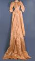DescriptionWoman's formal dress, probably for a wedding, of cream-colored silk satin. The bodice has a V-shaped neckline and a dipped waistline. It is draped with netting embroidered with faux pearls and clear glass beads on each side, the right side swagging over to the left across the center front opening, but currently with no means of fastening. The three-quarter-length sleeves are full at the top, being pleated into the armscye, which is at the natural shoulderline. The front side of each sleeve is gathered into the underarm seam at the inside of the elbow, while the back side of the sleeve has a single pleat at this point. The back of the bodice is cut continuously with the back of the skirt.