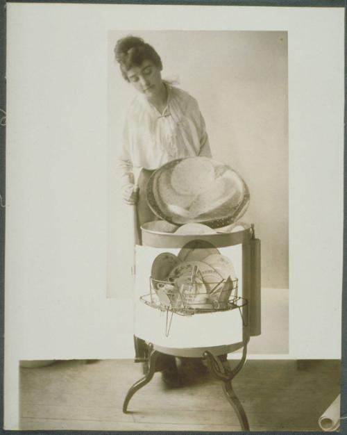 DescriptionWoman wearing a long skirt demonstrates a dishwasher, probably a Whirlpool dishwasher, with dishes in it. She holds a metal lid which reflects the contents of the cylindrical metal machine. A second overlaid photograph shows the rack that fits inside filled with plates, cups, saucers and silverware.