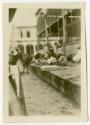 DescriptionView of a street market. Vendors are visible along the sidewalk of the street. A gated area is visible behind the vendors. People walk the street toward a public building beyond the market. The edge of a car is visible in the foreground.