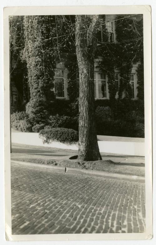 DescriptionView of building facade and cobblestone sidewalk. A large tree is posted in the middle of the sidewalk. An electrical wire is visible near the tree. Vines cover the whole facade of the building.