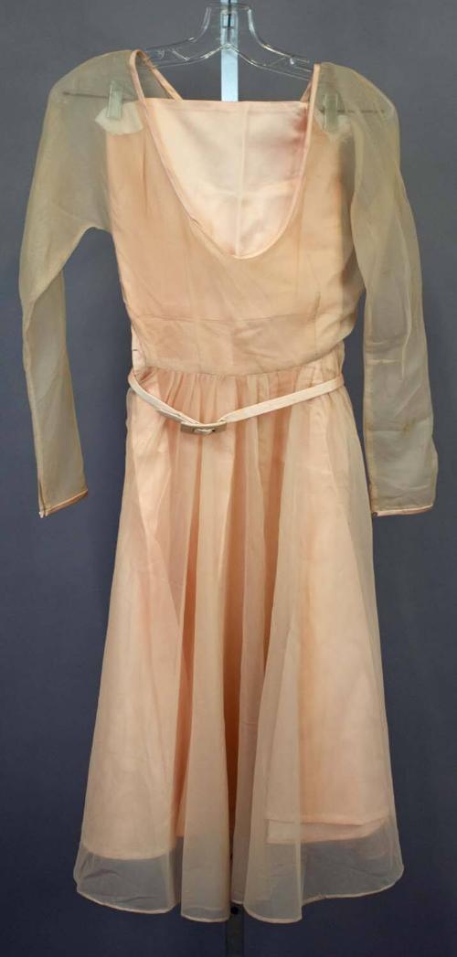 1950s homemade party dress made of pink chiffon and a silk under-dress. A thin pink belt completes the outfit. The chiffon dress has long sleeves, snap closures at the wrists, a zipper on the wearer's left side from the hip to underarm. The under-dress is strapless, has boning on inside of bodice, and a zipper with hook-and-eye on the wearer's left side from the hip to underarm. The belt has a buckle and snap closure.
