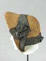 DescriptionWoman's bonnet made from natural-colored braided straw. The bonnet is trimmed with silk ribbon, 2 3/4 inches wide, patterned with small white checks broken by two black stripes on a black ground. The pattern of the braided straw is ornamental, creating a scalloped design along the outer edge of the strip. The brim is meant to angle slightly away from the face, more at the center top, which measures approximately 3 1/2 inches. The underside of the brim is lined with a very loosely woven cotton. There are thread pickings and heavier yarns under the brim which suggest the loss of other decorations. The inner edge of the brim underside, and perhaps the whole crown, seems to have been lined with a white silk fabric. This fabric is almost entirely gone. A heavy, covered wire is stitched along the edge of the brim for strength and shaping. This wire extends around the entire bottom of the bonnet. The brim ends extend down several inches below the back of the bonnet, creating two deep points at the chin line. The intersection between the crown and the brim is very indistinct. The crown measures approximately 3 1/2 inches at the center top, but there is no side to the brim at the bottom or back of the neck. The bottom edge of the crown is bound with a strip of plain braided straw. A narrow curtain made from straw is attached to the bound bottom edge. A wide ribbon is used to decorate the bonnet and create a curtain at the back of the neck. The ribbon is twisted and draped around the intersection between brim and crown, with a decorative bow stitched to the proper left side. A piece of the ribbon, lined with dark brown net, creates a curtain (a "bavolet") over that of straw, with double box pleats at the center back and double pleats to each side. There are no extant ties on this bonnet.