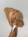 DescriptionWoman's spoon-shaped bonnet made of four-tone braided straw or grass trimmed under the brim with faux flowers and laces and decorated on the crown with silk ribbon. The braid is made of four different plant fibers: one is a light, golden-brown color; the second is a deep reddish-brown color (a dyed color); the third is a flat reed of a medium brown; and the fourth a dark brown, flat reed. The brim (or "poke") is wide at the center top (five inches), narrowing quickly to the sides (three inches), which extend down several inches below the line at the back of the neck. This shaping creates a flared brim above the face, on which has been stitched a mass of pink fabric flowers and a closely gathered strip of black net lace with a roll of white tulle underneath. Under this trim, the underside of the brim has been lined with a layer of very loosely-woven, white fabric. A piece of white lace attached to this tulle indicates there may be some white lace missing from this grouping. A covered wire is used to shape and support the edge of the brim. Stitched just beneath the decorations, to rest against the front of the head as a support, is a 7/8-inch-wide roll of what appears to be six layers of a heavy, cotton net. The ends of the brim form narrow points that curve up and back to the crown. The line formed by the brim and crown at the top of the bonnet extends eleven inches to the back. The oval back of the crown measures four inches wide x 4 1/2 inches high. The side of the crown at the base of the neck measures 1 5/8 inches in depth. The bottom of the bonnet, from the inner curves of the brim along the base of the crown, is stabilized by a strip of braided, plain straw, upon which is stitched a covered wire. The sides of the crown are also lined with the loosely-woven, white fabric. The outside of the bonnet is decorated with a wide silk ribbon also used to form the ties as well as the curtain ("bavolet") at the back of the neck. The light, orange-brown ribbon is 3 5/8 inches wide. It is folded and stitched to the narrow front points of the brim, then draped over the top with a large bow completing the effect. The ribbon continues as the ties, approximately two inches in length, ending in a slight diagonal. The curtain, 3 3/8 inches wide and lined with net, is edged at the bottom with a fine wire to shape the double pleats.