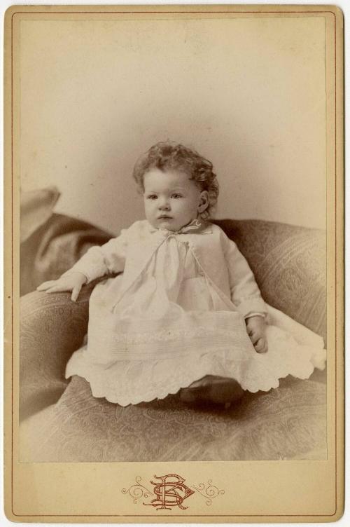DescriptionFull view studio portrait of an unidentified young child. The child is seated and wearing a white dress and a matinee jacket. The monogram "RSD" is printed on the cardboard below the photograph.
