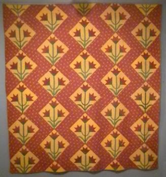DescriptionAppliquéd quilt in the Eight of Hearts pattern using deep red, or Turkey red, cotton. The quilt consists of a plain-woven white cotton top, batting, and backing that are joined with a quilted pattern. In a white block at one corner of the top is the inscription "Laura Grant/ Hartford/ Ct./ 1848"; this is hand-stitched in pink thread using a chain stitch. The appliquéd pattern consists of a field of eight-petal flowers surrounded by four arrows; this applique pattern is hand-stitched onto the quilt in alternating rows leaving white squares of the quilt top visible. The quilting pattern consists of a wreath in the plain squares and a flower in the appliqued squares. All four sides of the quilt have a pieced triangular border. Each edge of the quilt has a woven basketweave tape binding.