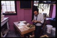 2015.196.144.97: Slide of Nucu sitting at desk of tools, materials, and artwork