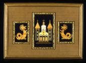 2015.196.144.112: Slide of completed, framed artwork - triptych of a Romanian church flanked by two dragons