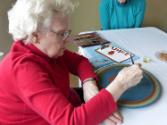 2015.196.248.15: born digital image showing Norwegian rosemaling mentor artist Eldrid Skjold Arntzen giving rosemaling demonstration; note her signature method of painting by resting her right hand on her left.