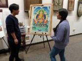 2015.196.248.33: born digital image showing Tibetan thangka painting apprentice Tsering Yangchen talking to a visitor next to a thangka painting by Jampa Tsondue
