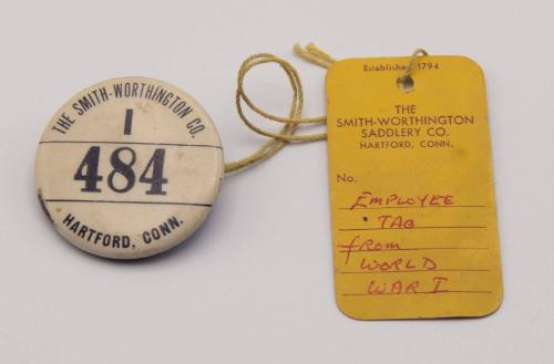 DescriptionThe Smith-Worthington Saddlery Company (a) pin-back button and (b) tag WWI Employee Tag, No. 484. The button has a white background with black text. The tag is yellow with brown text and red handwriting.