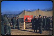 (.1) A crowd of soldiers in uniform with weapons and steel helmets standing in a military camp in front of a tent. A tall wooden sign sits in the middle of the image next to some of them. The sign with a red background has a soldier with a weapon kneeling next to a small white cross, and reads in white text, "WALDIE / Chapel.” Mountains are in the background.