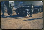 (.11) General [Joseph P.] Cleland of the 40th Division standing with other soldiers next to a jeep convert.