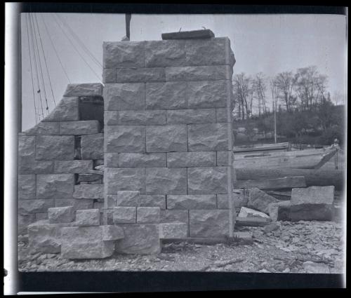 (.59) View of a partially constructed granite block wall with the stern of schooner TOM BEATTIE and trees in the background.