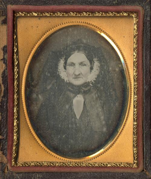 DescriptionNinth plate daguerreotype portrait of a woman, possibly Mercy Lovering Bancroft. She is wearing a dress and what appears to be a piece of headwear tied with a ribbon under her chin and trimmed with a strip of lace (or other adornment) that covers the ears. She is wearing eyeglasses.