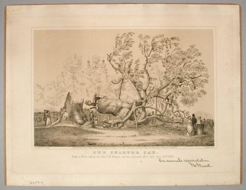 InscribedOn recto, lithographed title beneath image, "THE CHARTER OAK. / From a View taken for the Hon. I.W. Stuart on the morning of its fall, Aug. 21st 1856." Lithographic facsimile of handwriting, lower right, "An accurate representation. / I.W. Stuart." Lower left, in pencil, "D 23 #6-a".On verso of mount, in pencil: upper left, "1856-0"; lower right, accession number.