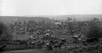People and horse-drawn carts gathered in front of tents, Canaan, Connecticut